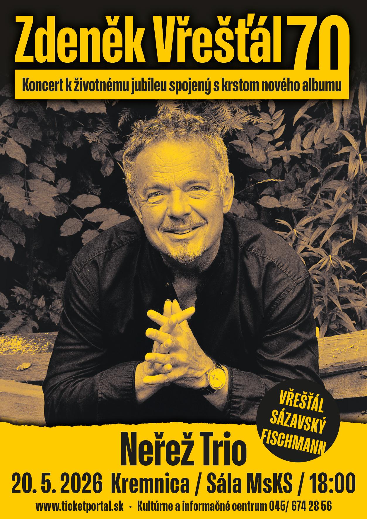 Zdeněk Vřešťál - zakladajúci člen NEREZU jubiluje! Pri tejto príležitosti kapela NEŘEŽ TRIO v zložení: Zdeněk Vřešťál, Vít Sázavský a Róbert Fischman odohrá sériu jedinečných koncertov na Slovensku k životnému jubileu spojených s krstom nového albumu. Buďte pri tom a užite si to!