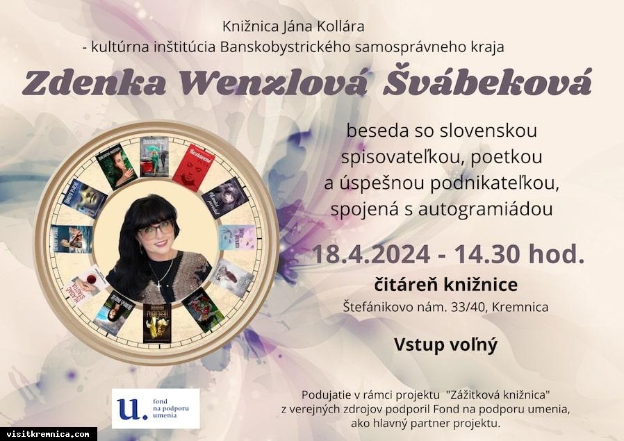 Pozývame Vás na besedu spojenú s autogramiádou so slovenskou spisovateľkou, poetkou a úspešnou podnikateľkou, Zdenkou Wenzlovou - Švábekovou.