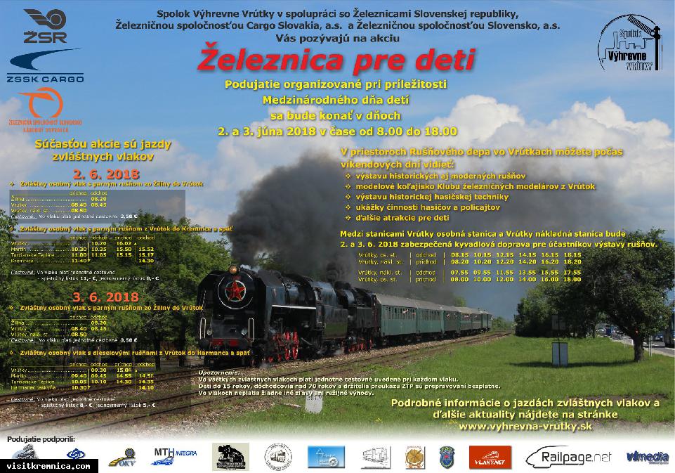 Do Kremnice v rámci podujatia Železnica pre deti zavíta v sobotu historický vlak. Spolok Výhrevne Vrútky v spolupráci so ŽSR, železničnou spoločnosťou Cargo Slovakia, a.s. a Železničnou spoločnosťou Slovensko vypravia z Vrútok do Kremnice a späť zvláštny osobný vlak s parným rušňom. Vlak sa v Kremnici zdrží v čase od 11.40 do 14.30.