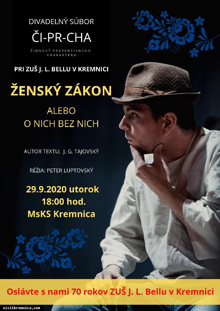 ZUŠ J. L. Bellu a DS Či-Pr-Cha Vás, pri príležitosti 70. výročia založenia ZUŠ J. L. Bellu, pozývajú na divadelné predstavenie Ženský zákon, alebo o nich bez nich. Autor textu: J. G. Tajovský, réžia: Peter Luptovský.